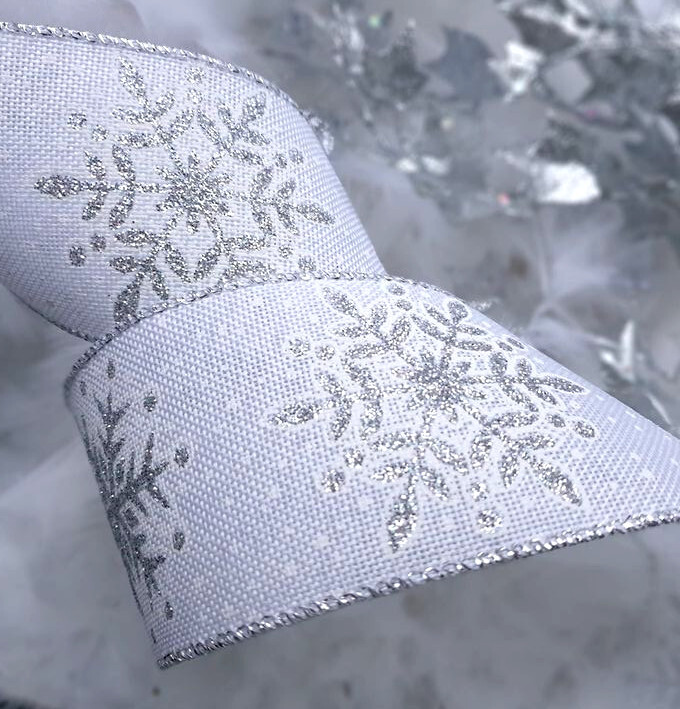 1m 63mm Wired Christmas Ribbon White + Silver Sparkly Glitter Hologram Snowflake | eBay